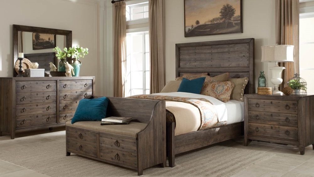 An expansion of the Mount Vernon Collection with clean, simple lines. Crafted of solid maple in two compatible wire-brushed finishes, Trenton Grey and Whiskey. Mitered cases and inset beading on drawer fronts, accented with hand-driven nails. Casual antiqued ring pull hardware and key escutcheons. Drawers feature soft-close guides, some with cedar-bottom lower drawers. Side-tapered square legs and touches of fabric appeal to modern consumers. Four bed options.